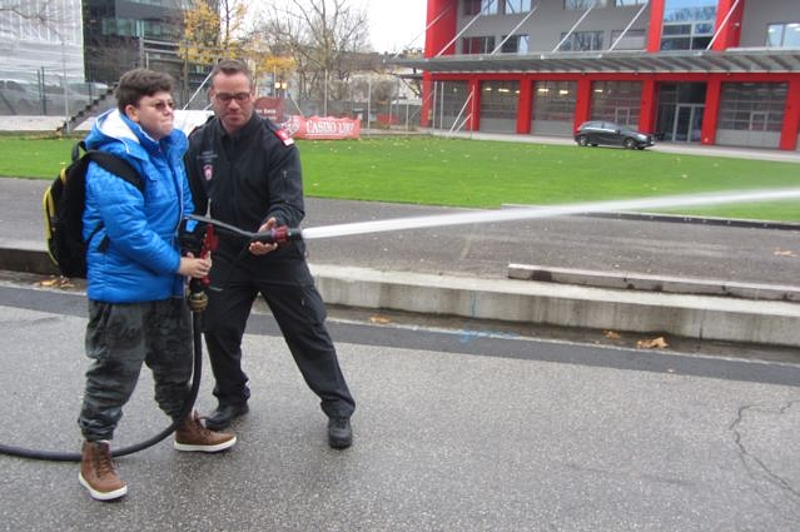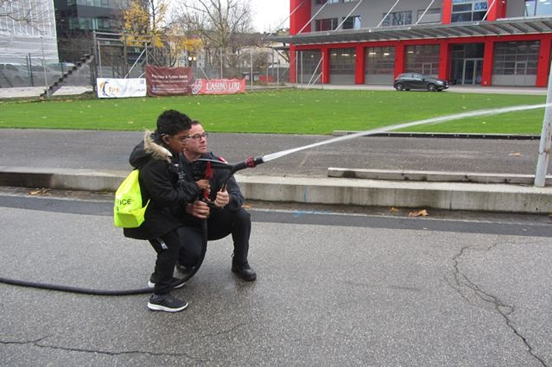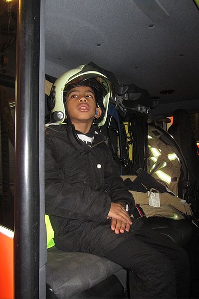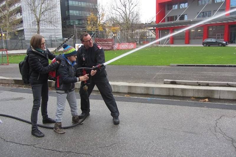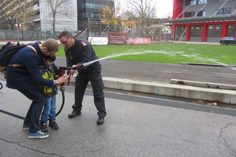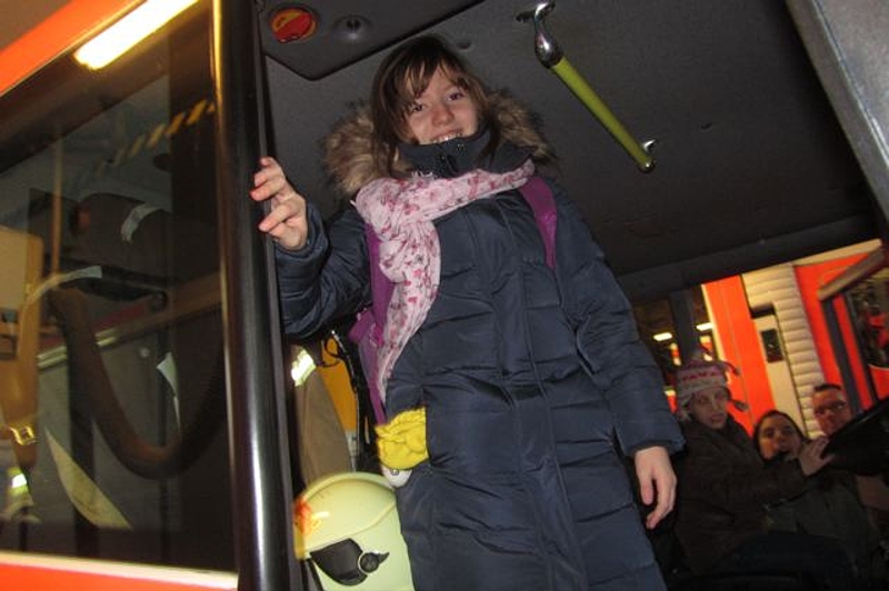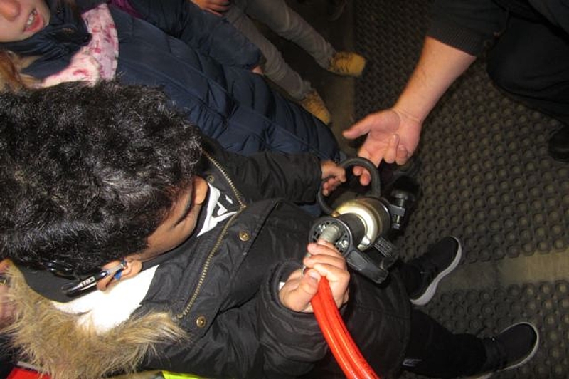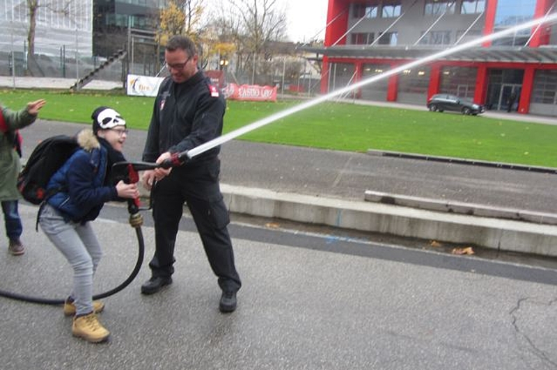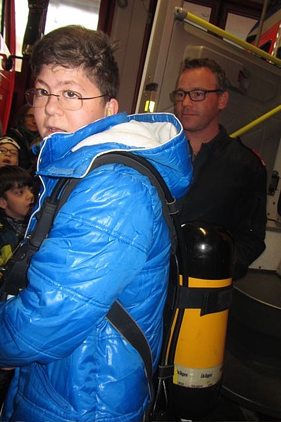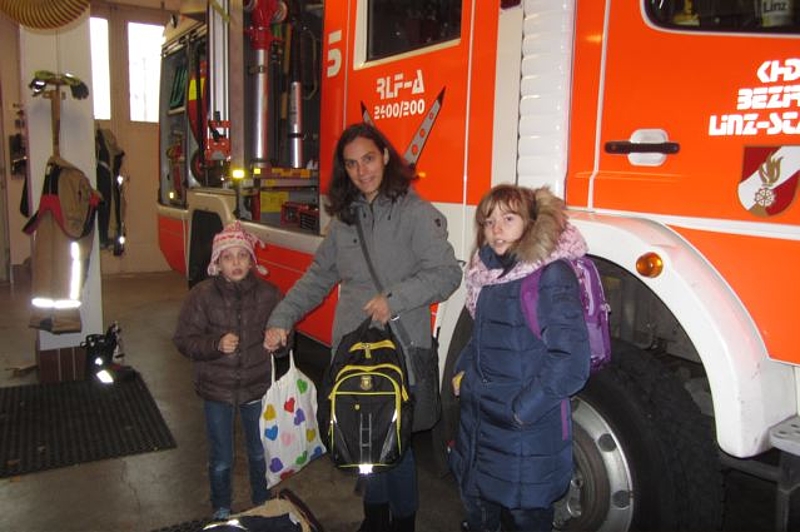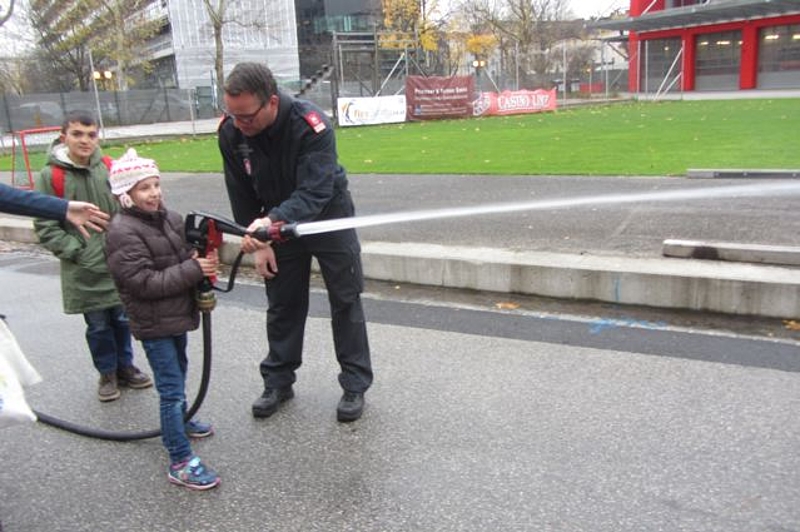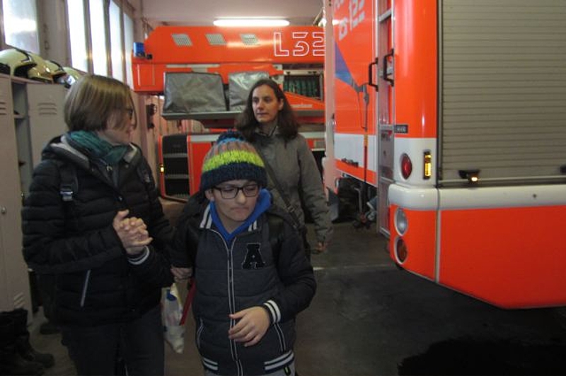 Am 15.11.2017 fuhren mit dem Bus und der Straßenbahn zur Berufsfeuerwehr. „Unser Feuerwehrmann“ machte eine ganz tolle Führung mit uns. Wir durften Kleidung und Helme probieren und uns in ein Feuerwehrauto vor das Lenkrad setzen! Besonders aufregend war das Spritzen mit dem Wasserschlauch. Außerdem fuhren wir zwei rasend schnelle Runden mit dem Feuerwehrauto. Das war wirklich wunderbar!