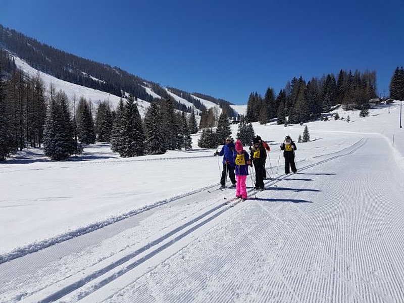 Langlaufen in Hinterstoder. Auf der Sportliste standen Langlaufen, Wettrennen, Wandern und Rutschteller rutschen.