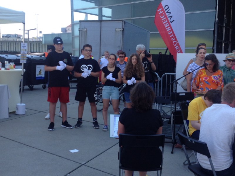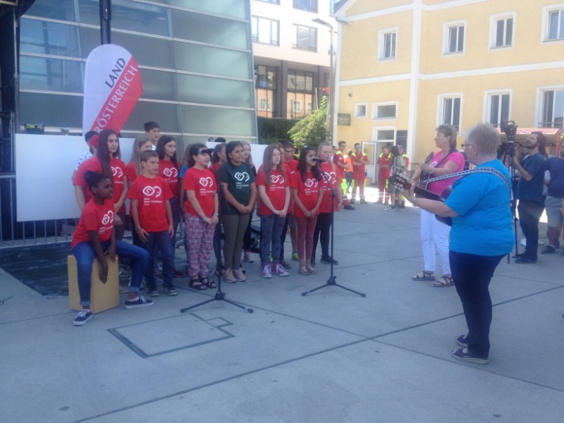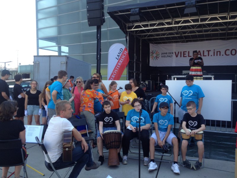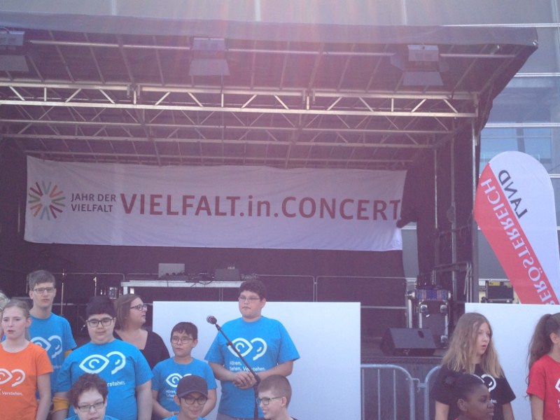 Gemeinsam eröffneten Schüler und Schülerinnen der 1. und 3. IMS und der Sehbeeinträchtigtenklassen mit ihrem Chor das Fest "VIELFALT.in.CONCERT" am Weltflüchtlingstag. Bei extrem heißen Temperaturen sangen sie Lieder und ein Gebärdenchor "übersetzte" die Liedtexte in Gebärdensprache.