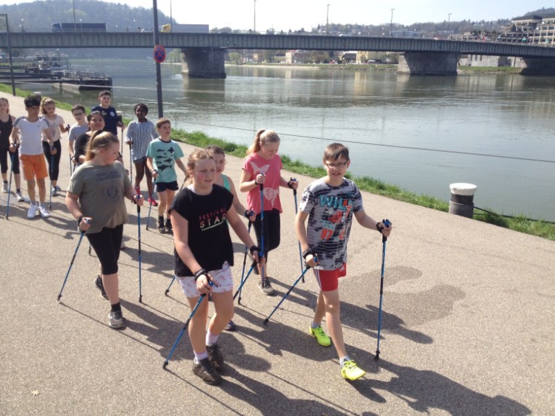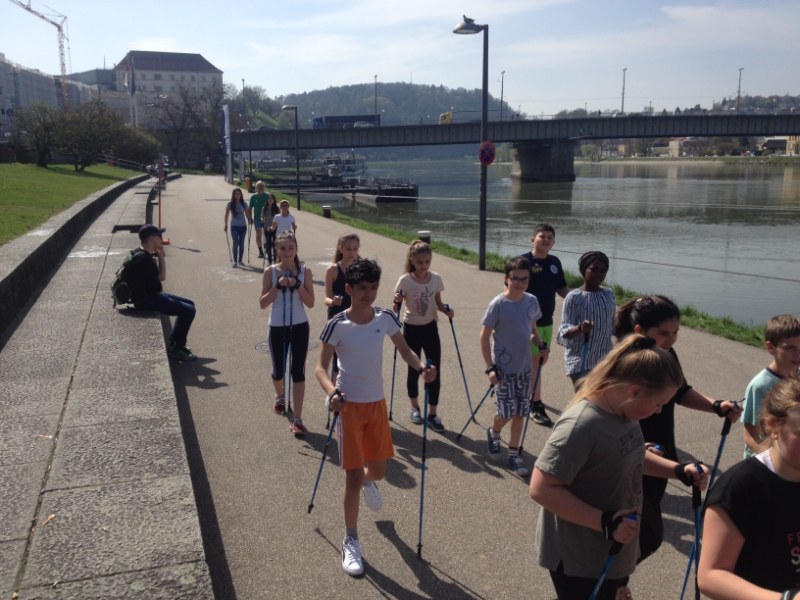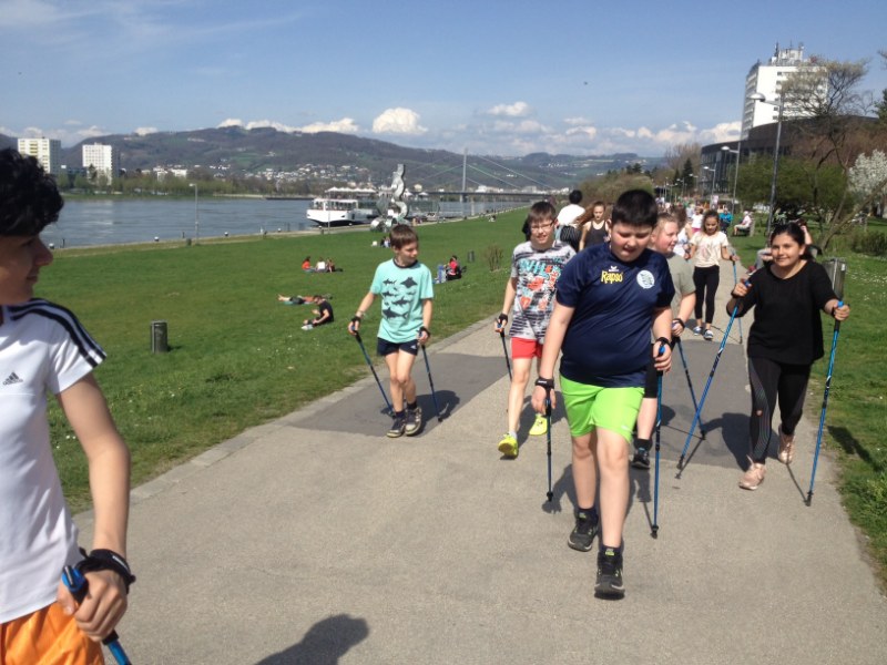 Die ersten schönen Frühlingsnachmittage nutzten wir gleich und verlegten die Turnstunde nach draußen. Walken stand auf dem Programm. Zuerst wurde die Walkingstocklänge richtig eingestellt und kurz die Technik erklärt. Dann ging es los. Gemeinsam walkten die Schüler und Schülerinnen der 1. IMS und 1. HMS zur Donau und entlang der Donaulände Richtung alter Eisenbahnbrücke. Beim Rückweg waren wir so flott, dass sich zur Belohnung sogar ein Stopp bei der Eisdiele in der Stadt ausging. Es hat Spaß gemacht und wir werden die nächste schöne Turnstunde gleich wieder walken gehen.