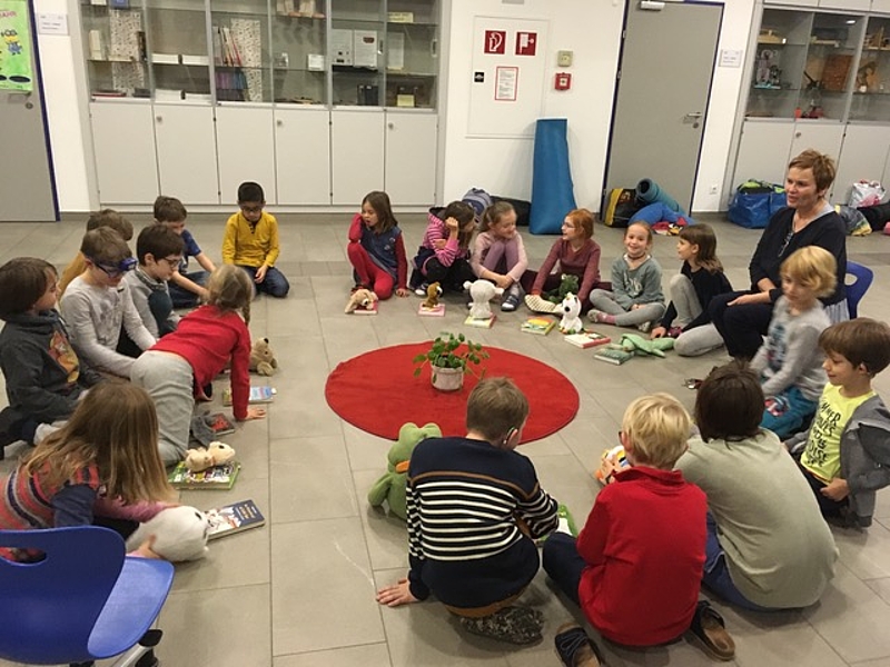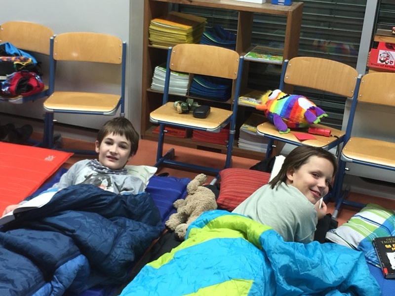 Mit Sack und Pack (Schlafausrüstung, Waschzeug, Kuscheltier) sowie Lesestoff kamen wir um 18.30 h wieder in die Schule. Nachdem wir unsere Kuscheltiere und Lieblingsbücher vorgestellt hatten fand eine Schulrallye im ganzen Schulhaus statt. In Kleingruppen flitzten wir durch die Schule und lösten die Aufgaben. Außerdem wagten wir uns mit unseren Taschenlampen in das Dunkel unseres Schulgartens und liefen eine Runde am Sportplatz. Das war aufregend und spannend!