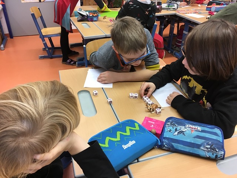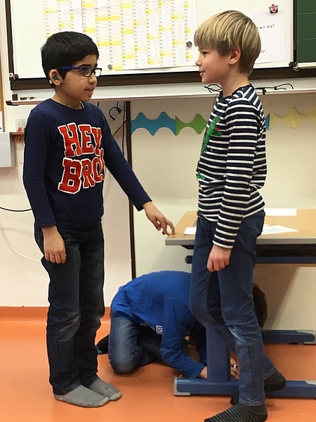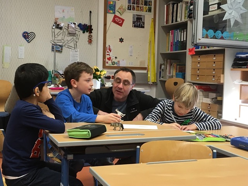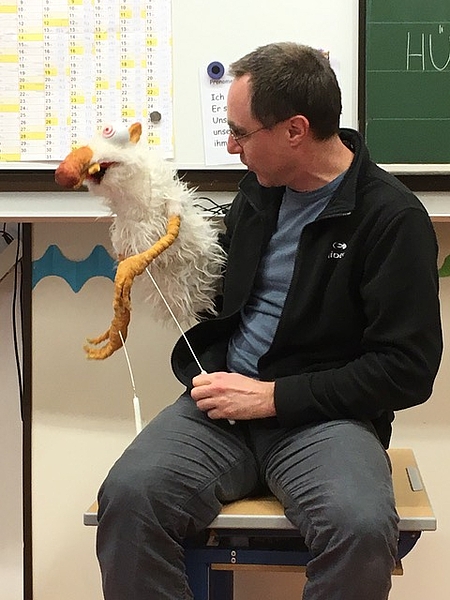 Schon zum zweiten Mal war der Schauspieler Olaf Heuser zu Gast und gestaltete mit der Klasse einen Lesetheater-Workshop. Beim Erzählen der Geschichten mit Hilfe kleiner Utensilien, zum Beispiel BIlderwürfel, Plastiktieren und Tierbildern verstand er es, die Kinder in seinen Bann zu ziehen. Er erzählte kurze Geschichten, in die alle einbezogen wurden. Gleichzeitig wurde die Fantasie angeregt und es entstanden spontan Ideen für eigene Geschichten. Diese wurden anschließend gezeichnet, gespielt und erzählt. Nicht nur das Erfinden und Erzählen machte großen Spaß, sondern auch das Zuhören.