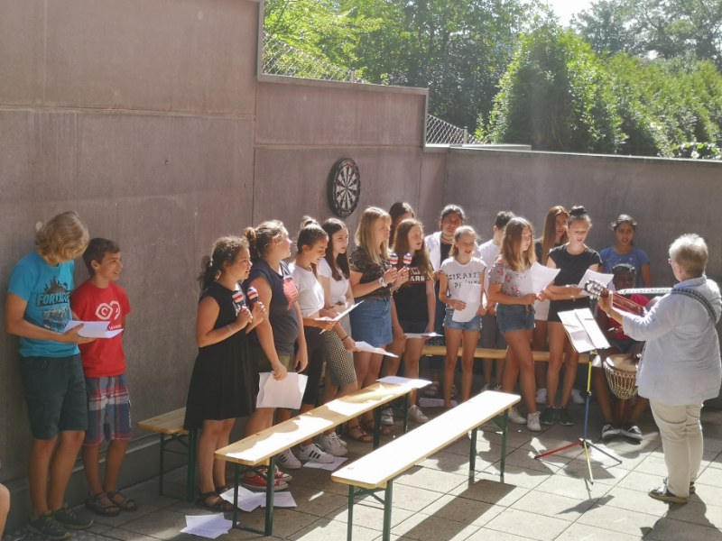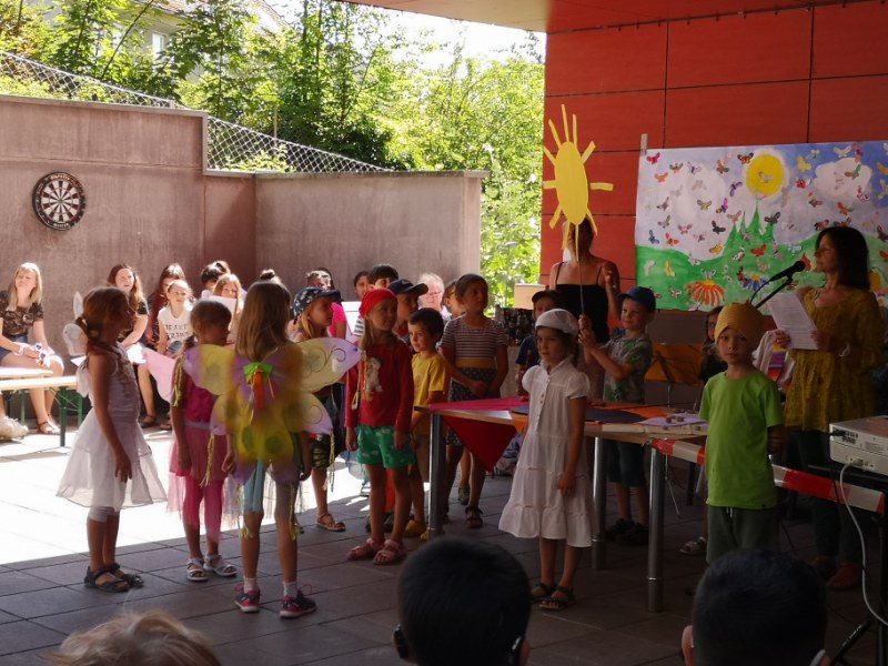 Der Schmetterling stand im Mittelpunkt dieser Feier und auch die Erkenntnis, dass wir Gott nur lieben können, wenn wir uns alle lieben. Wir beteten ein islamisches Gebet und das Vater Unser. Musikalisch umrahmte der Chor der 2. IMS die Feier.